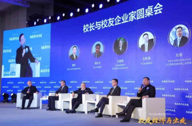 在校长与校友企业家圆桌会中,武汉大学副校长周叶中与九州通集团董事长刘宝林、当代集团董事长艾路明、华工科技董事长马新强、长江国际金融投资董事长刘萌、奥山集团董事长邬剑刚、京山轻机董事长李健等校友共话“校友经济”,认为武汉校友经济正在向更高阶段升级。