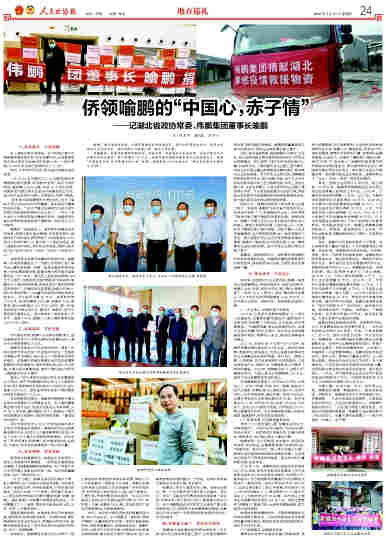 今日出版的《人民政协报》以整版报道我省知名侨领,中国侨商联合会常务副会长、湖北省政协常委、海外湖北社团合作联盟主席、湖北省侨商协会会长、武汉黄冈商会会长伟鹏集团喻鹏董事长的抗疫事迹。