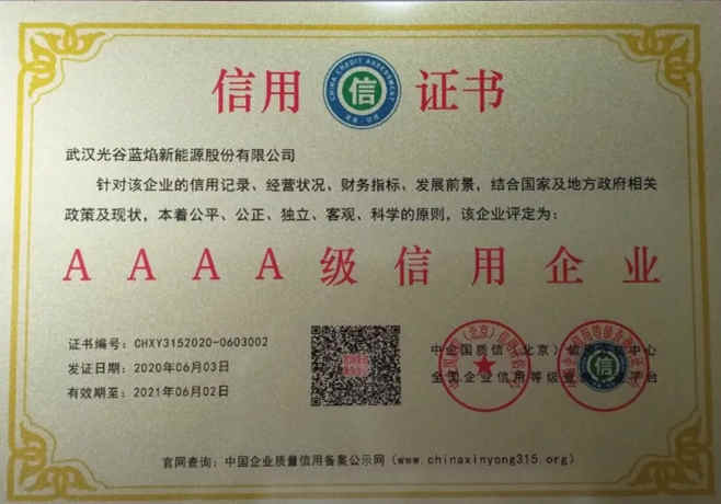 信用证书对光谷蓝焰的评定为“针对该企业的信用记录、经营状况、财务指标、发展前景,结合国家及地方政府相关政策及现状,本着公平、公正、独立、客观、科学的原则,该企业评定为AAAA级信用企业。”官网查询:中国企业质量信用备案公示网(http://www.chinaxinyong315.org/)。