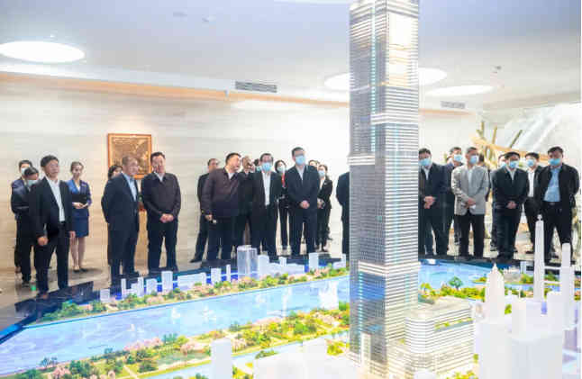 在沉浸式多媒体展厅,程用文市长一行通过3D影片了解项目设计规划情况及商务办公、超五星级酒店、云端会客厅、顶层观光、空中音乐厅等业态场景。程用文市长对项目极具未来感的独特设计,展示的丰富文化内涵,充满活力和品位的未来城市生活图景表示赞赏。